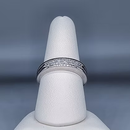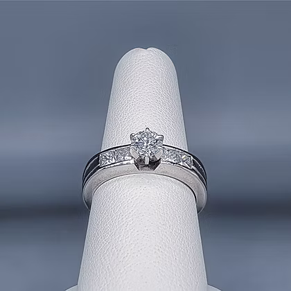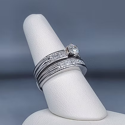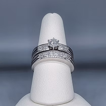 Solitaire ring centre set with a 0.50ct brilliant cut diamond on a 14ct white gold mount set with princess cut diamonds and matching eternity ring.