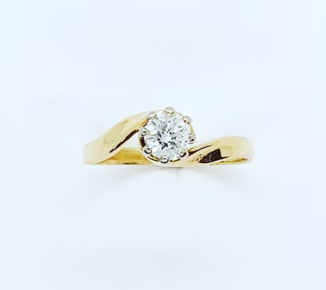Diamond twist solitaire ring fashioned from 18ct gold and set with a brilliant cut diamond.