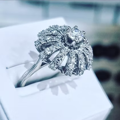 A unique cluster ring design that features a diamond set fanned dome mount that displays acentre set 0.50ct round cut diamond.