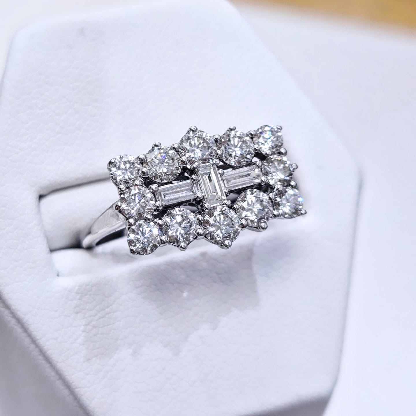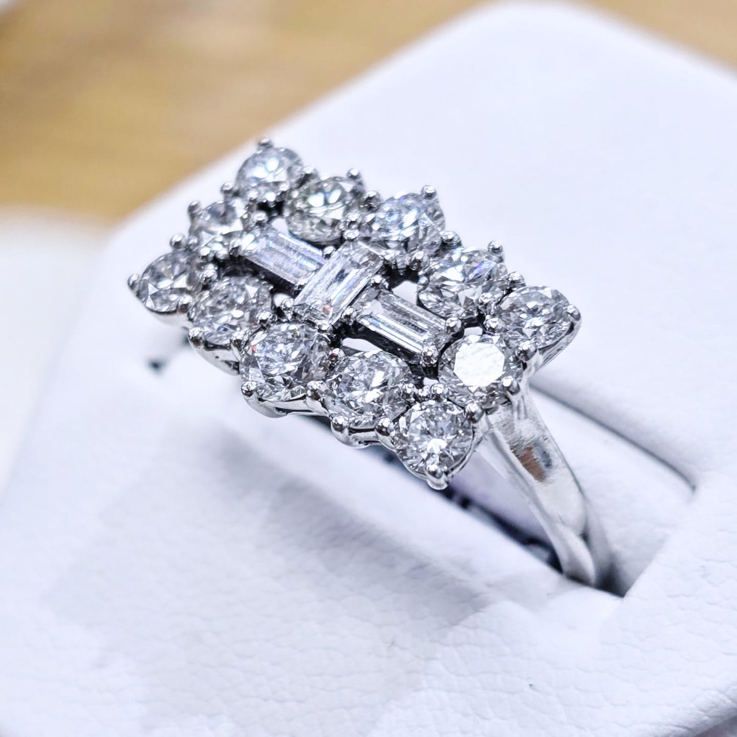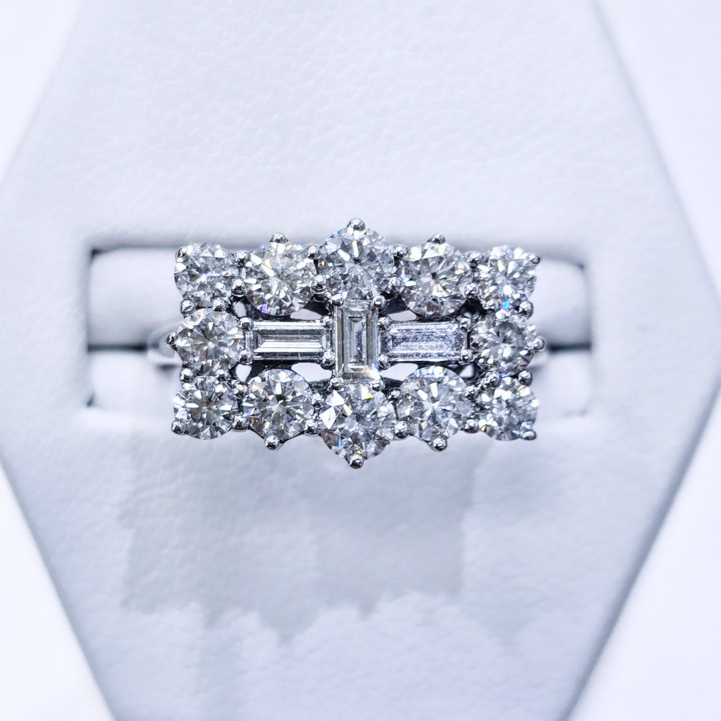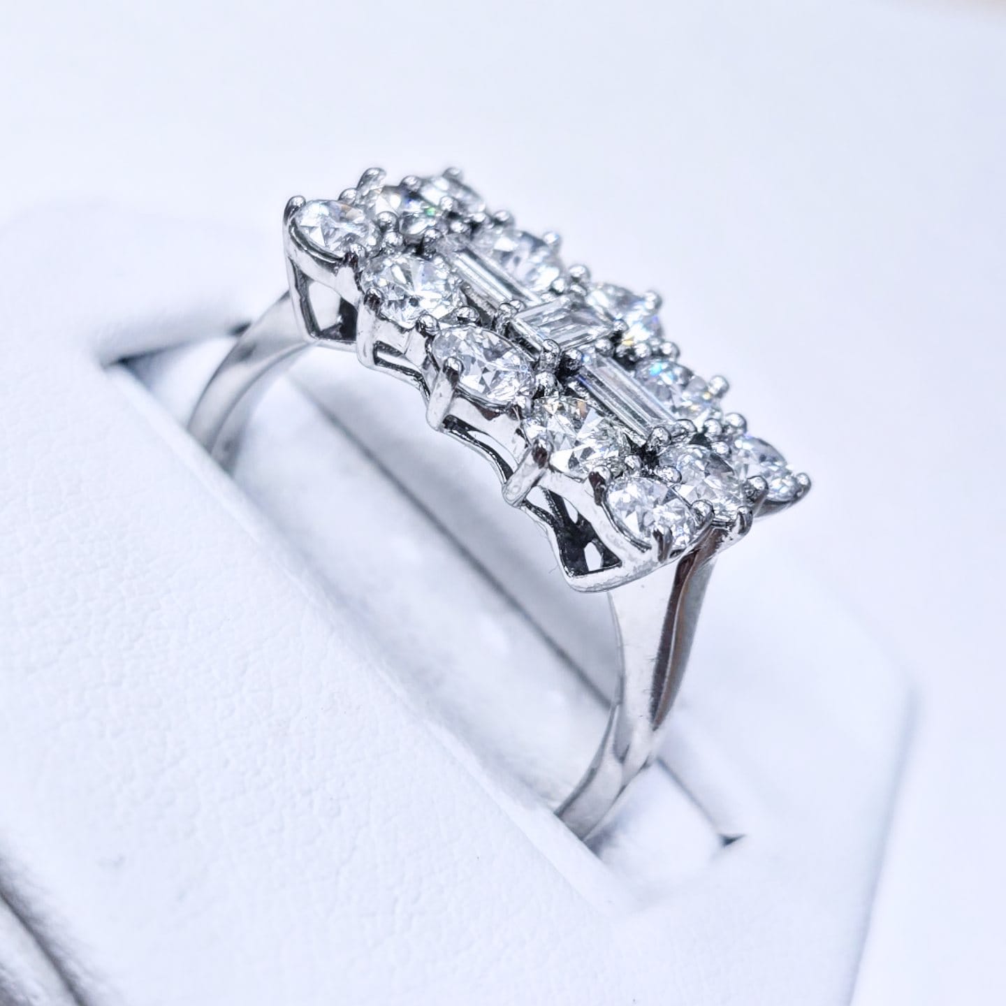 This classic design is set with 2.00ct’s of baguette cut and round brilliant cut diamonds on 18ct gold.