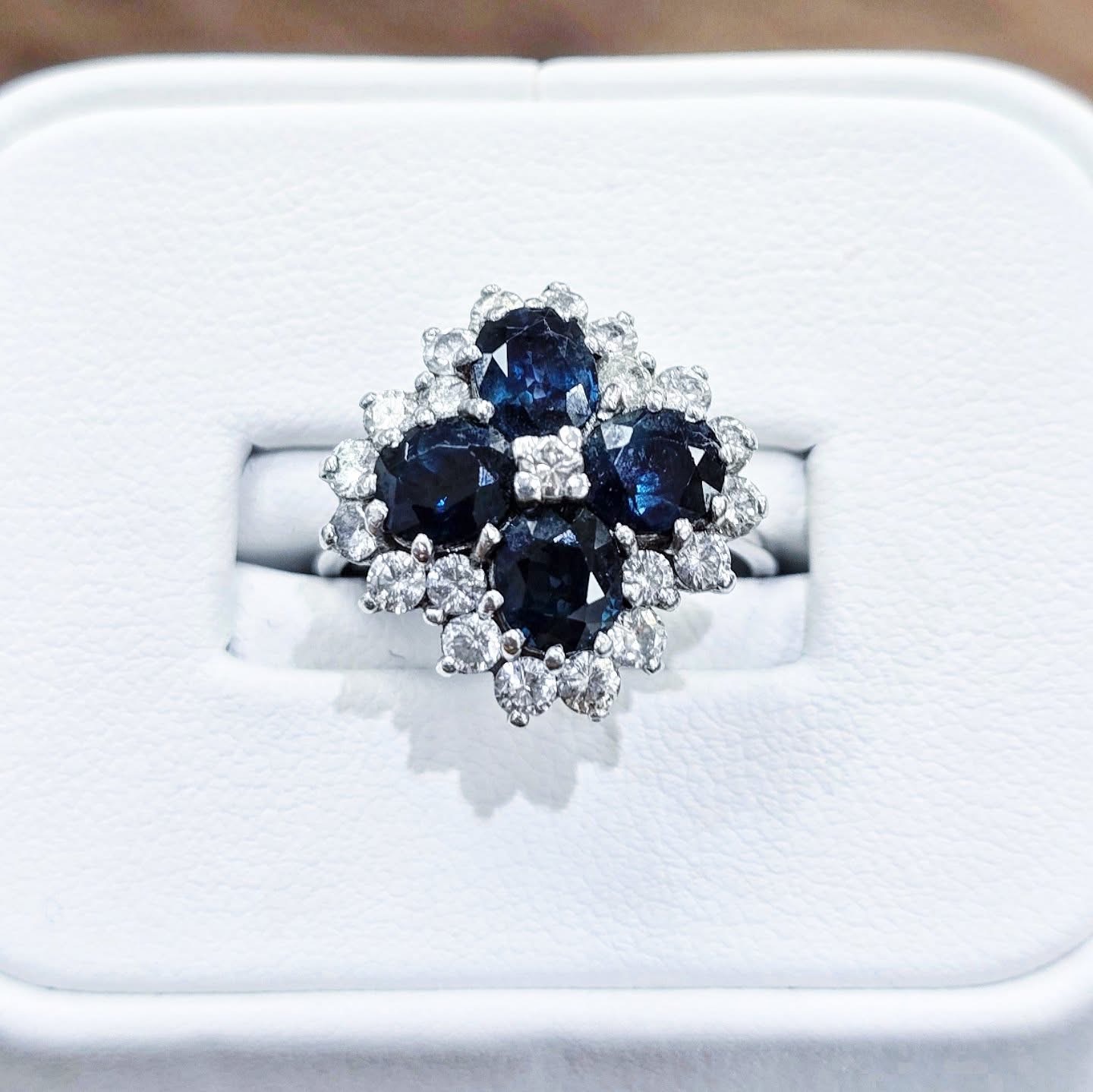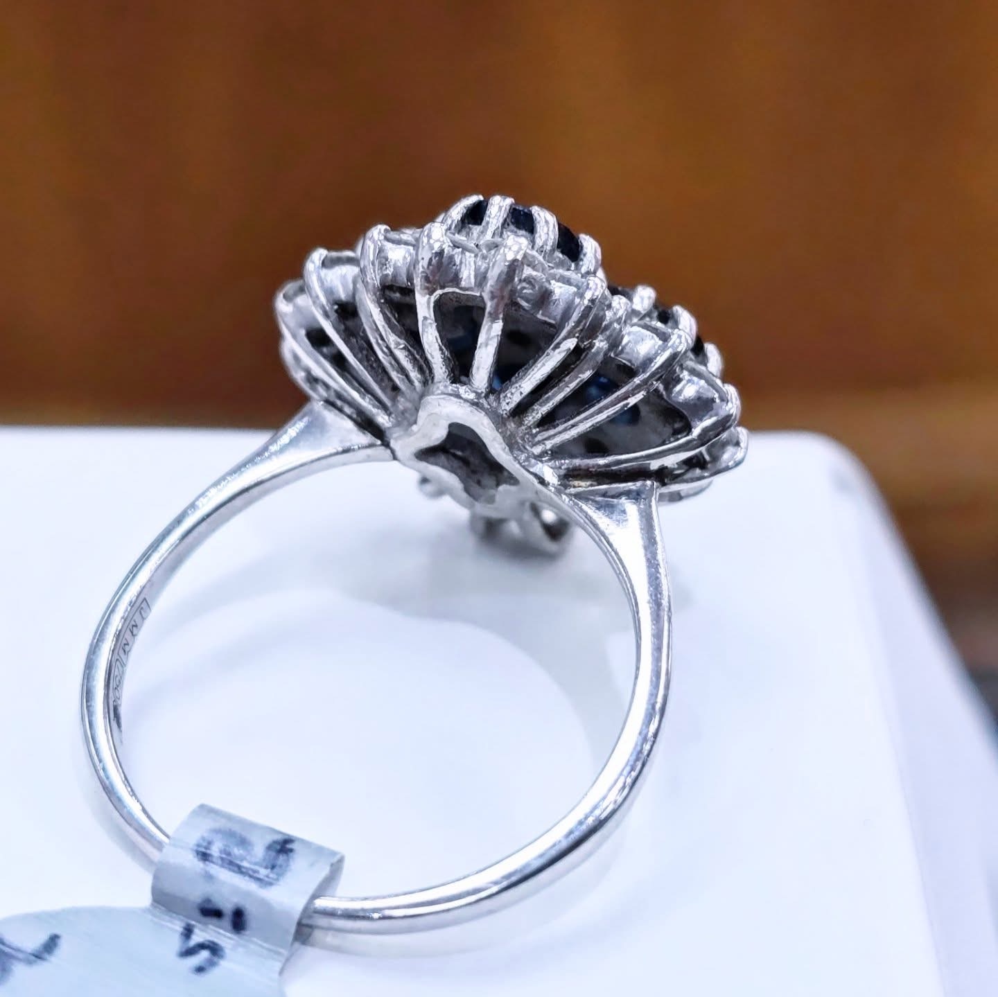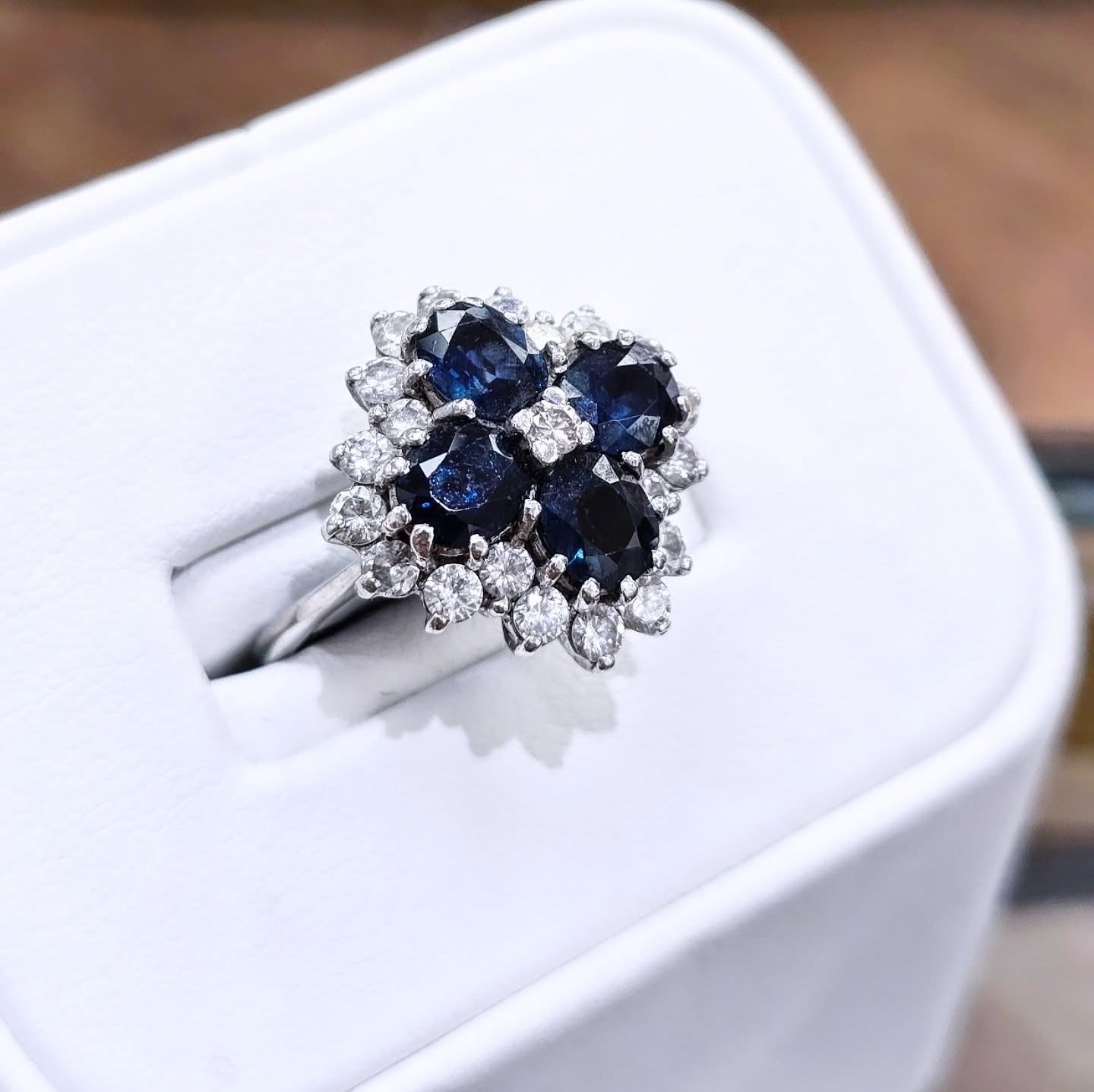 Cluster ring set with sapphires and diamonds on 18ct white gold.