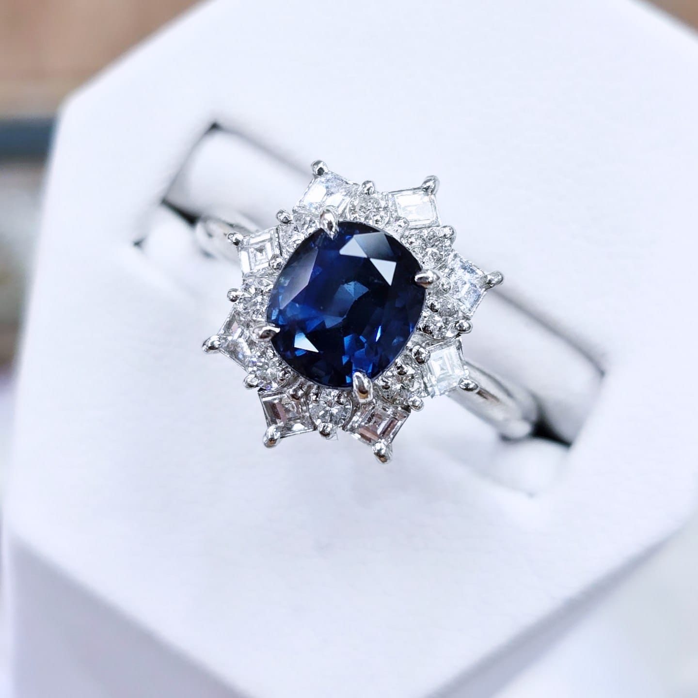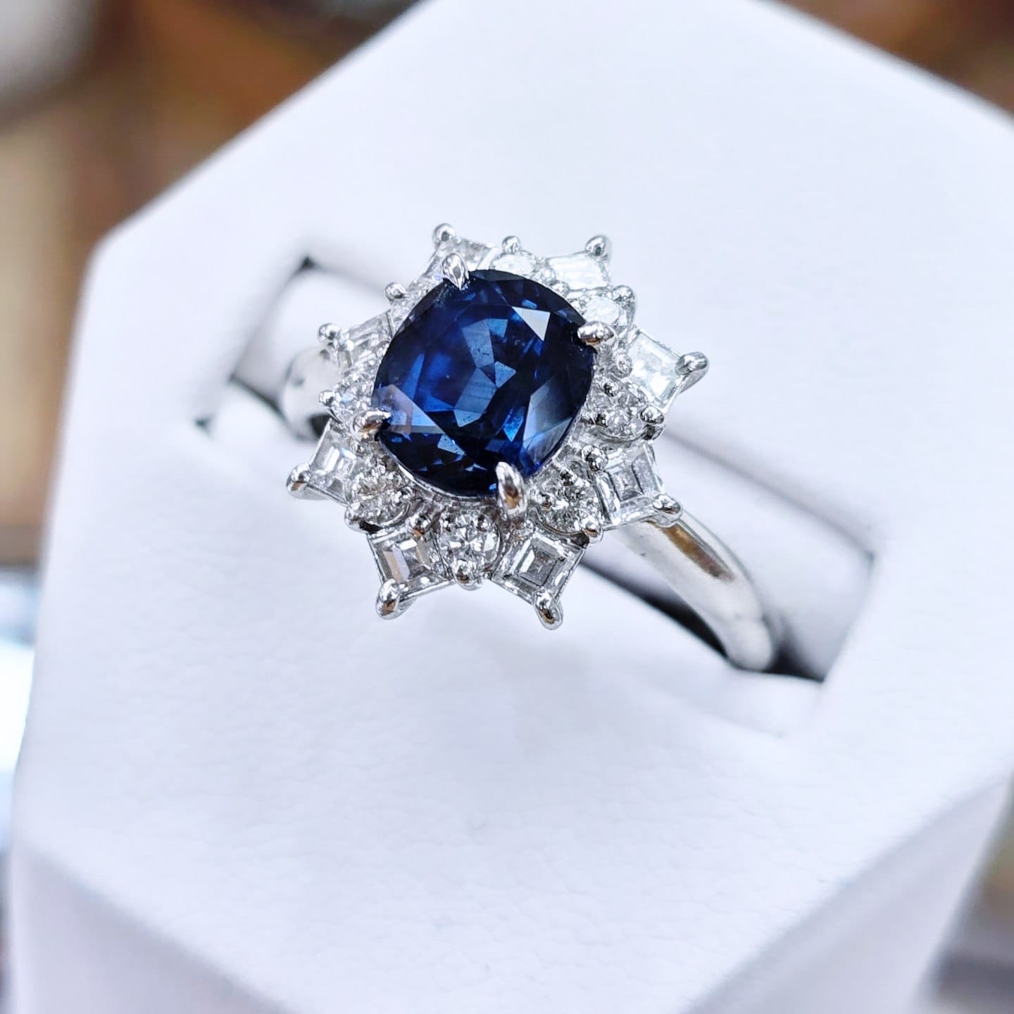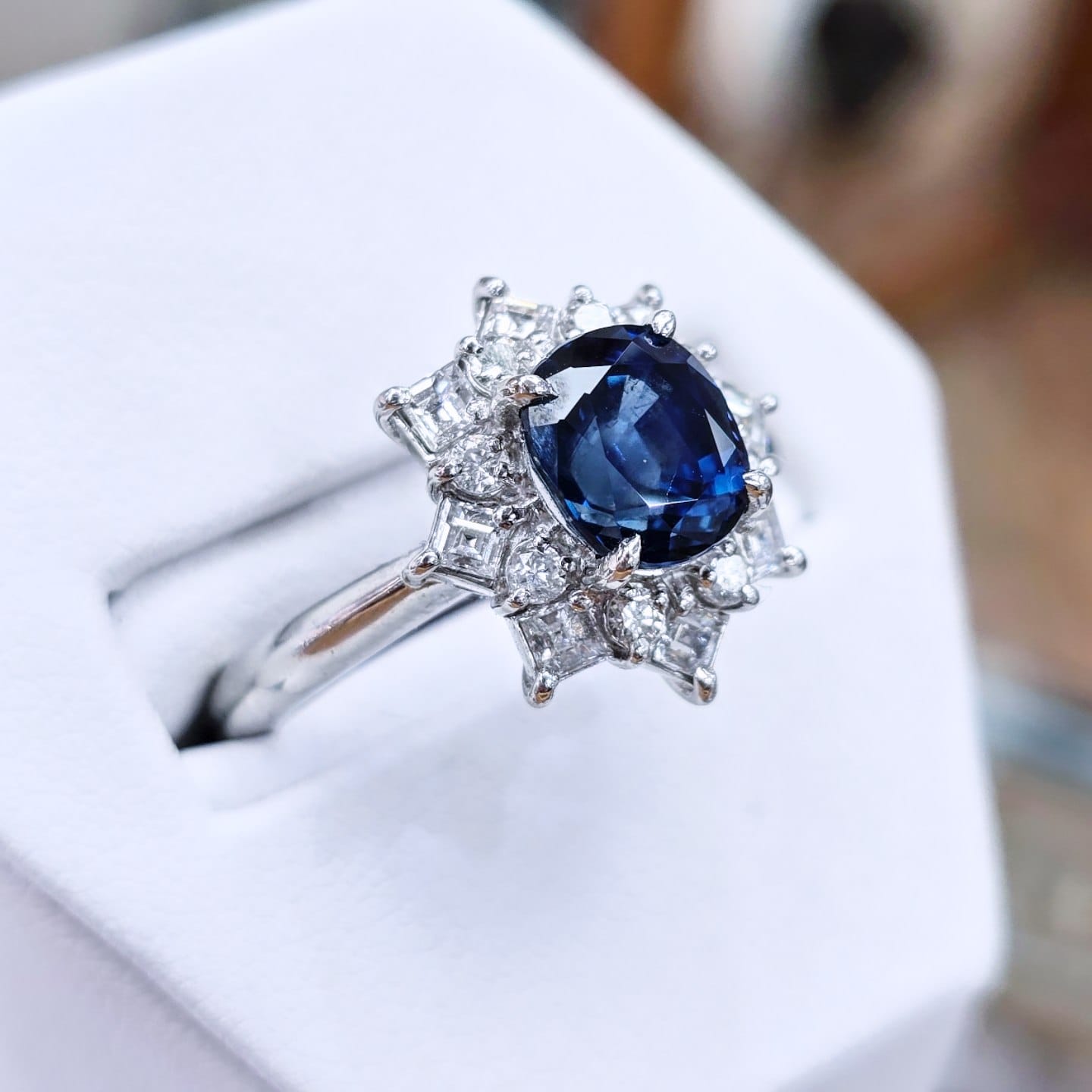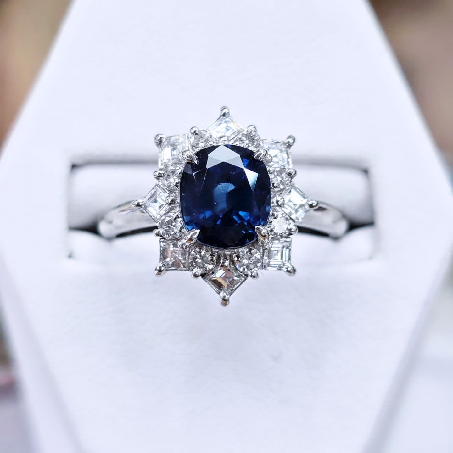 This spectacular cluster ring is set with a beautiful 2.97ct oval cut sapphire framed in a stunning halo of square step cut and round brilliant cut diamonds on a platinum mount.